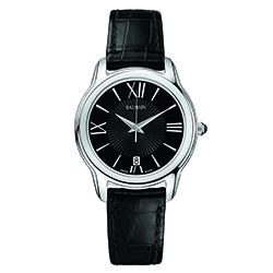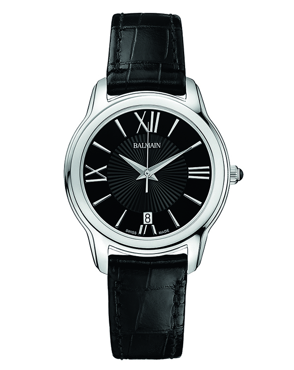 | 5. Модель «Miss Balmain Dream» B1891.32.62 Стальной корпус; чёрный с гильошированием циферблат с белыми римскими цифрами (III, VI, IX, XII) и условными индексами, с серебристыми гранёными центральными стрелками часов и минут, серебристой центральной секундной стрелкой; чёрный ремешок из натуральной кожи. |