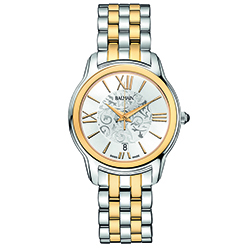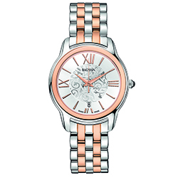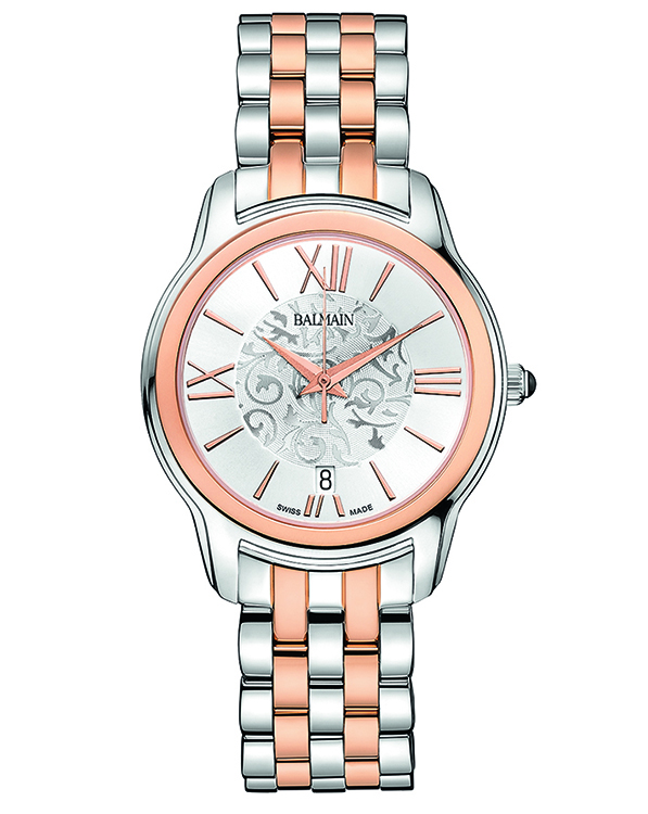 | 12. Модель «Miss Balmain Dream» B1898.33.12 Стальной корпус с безелем, имеющим PVD-покрытие красным золотом; серебристый циферблат, украшенный фирменным орнаментом в виде арабесок, с римскими цифрами (III, VI, IX, XII), условными индексами, центральными гранёными стрелками часов и минут, центральной секундной стрелкой – с отделкой PVD-покрытием из красного золота; стальной наборный браслет, чётные ряды звеньев с PVD-покрытием красным золотом. |