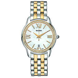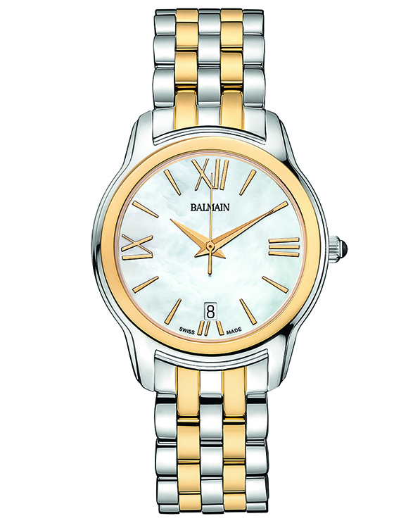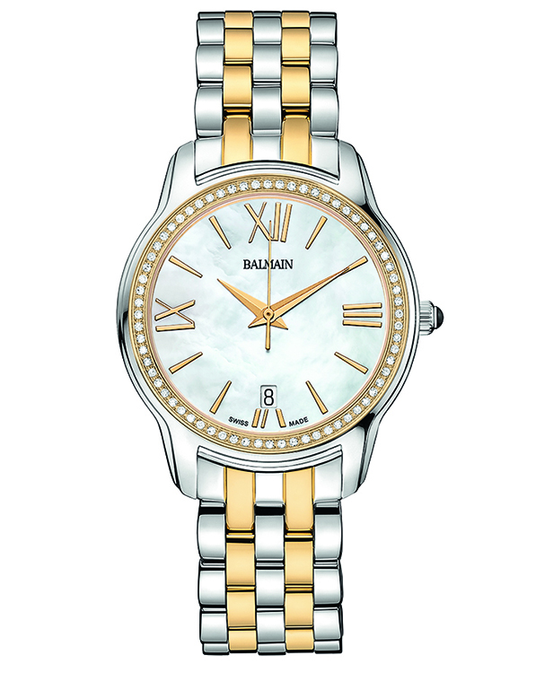 | 11. Модель «Miss Balmain Dream» B1893.39.82 Стальной корпус с безелем, имеющим золотое светло-жёлтое PVD-покрытие и инкрустацию 68 бриллиантами общим весом 2,26 карат. Белый перламутровый циферблат с римскими цифрами (III, VI, IX, XII), условными индексами, центральными гранёными стрелками часов и минут, центральной секундной стрелкой – с отделкой золотым светло-жёлтым PVD-покрытием; стальной наборный браслет, чётные ряды звеньев с PVD-покрытием светло-жёлтым золотом. |