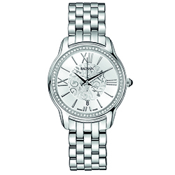 | 9. Модель «Miss Balmain Dream» B1895.33.12 Стальной корпус с безелем, инкрустированным 68 бриллиантами общим весом 2,26 карат; серебристый циферблат, с декором в виде арабесок, с белыми римскими цифрами (III, VI, IX, XII) и условными индексами, с гранёными центральными стрелками часов и минут, центральной секундной стрелкой; стальной наборный браслет. |