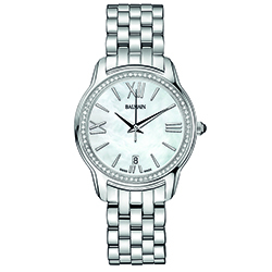 | 10. Модель «Miss Balmain Dream» B1895.33.82 Стальной корпус с безелем, украшенным 68 бриллиантами общим весом 2,26 карат; белый перламутровый циферблат с римскими цифрами (III, VI, IX, XII) и условными индексами белого цвета, с гранёными центральными стрелками часов и минут, центральной секундной стрелкой; стальной наборный браслет. |