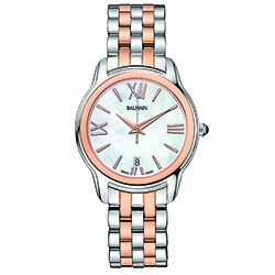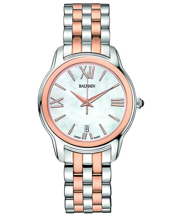 | 13. Модель «Miss Balmain Dream» B1898.33.82 Стальной корпус с безелем, имеющим PVD-покрытие красным золотом; белый перламутровый циферблат с римскими цифрами (III, VI, IX, XII), условными индексами, центральными гранёными стрелками часов и минут, центральной секундной стрелкой – с PVD-покрытием красным золотом; стальной наборный браслет, чётные ряды звеньев с отделкой PVD-покрытием из красного золота. |
