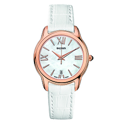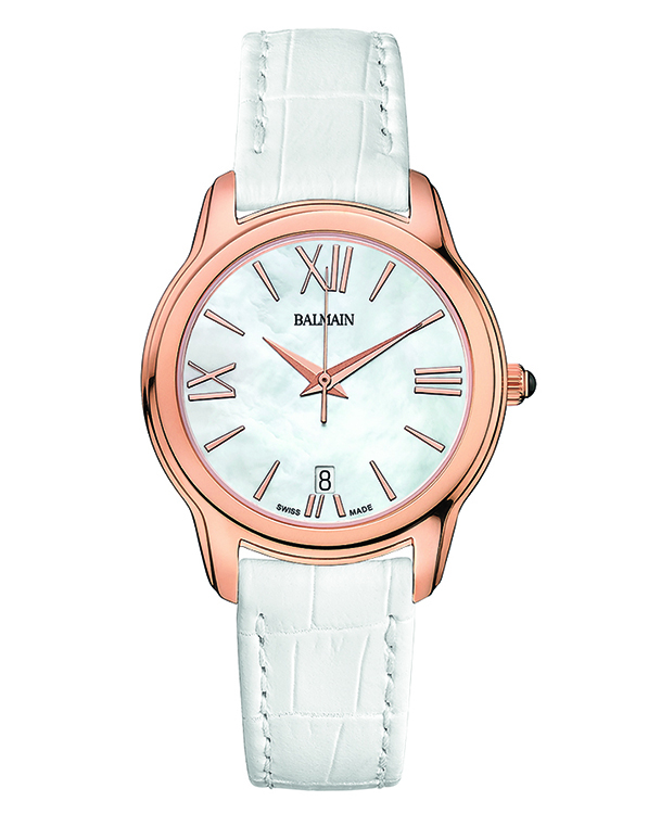 | 14. Модель «Miss Balmain Dream» B1899.22.82 Стальной корпус с безелем, имеющим PVD-покрытие красным золотом; белый перламутровый циферблат с римскими цифрами (III, VI, IX, XII), условными индексами, центральными гранёными стрелками часов и минут, центральной секундной стрелкой – с PVD-покрытием красным золотом; белый кожаный ремешок. |