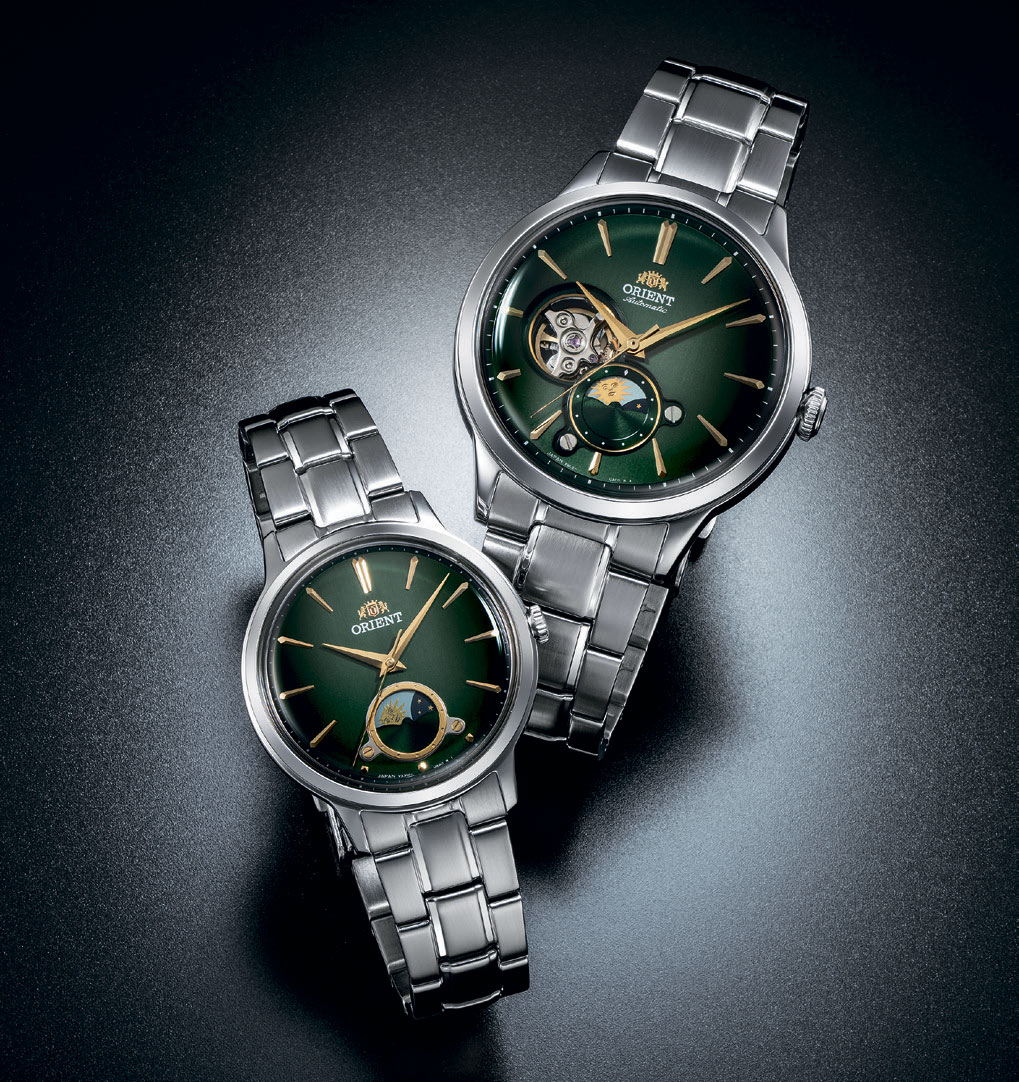 Яркий акцент коллекции составляют лимитированные парные модели с изысканным зеленым градиентным циферблатом с золотыми стрелками, выпущенные к 70-летнему юбилею Orient тиражами 1000 шт. (мужские часы) и 500 шт. (женcкие часы).