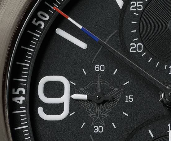 На чёрном циферблате, состоящем из двух частей, расположены центральные никелевые – часовая, минутная и секундная стрелки. Из них первые две – покрыты люминесцирующим составом «Superluminova». Таким же составом обработаны часовые метки и цифры «3» и «9». Кончик секундной стрелки хронографа последовательно окрашен красным, белым и синим цветом, как флаг Французской Республики.