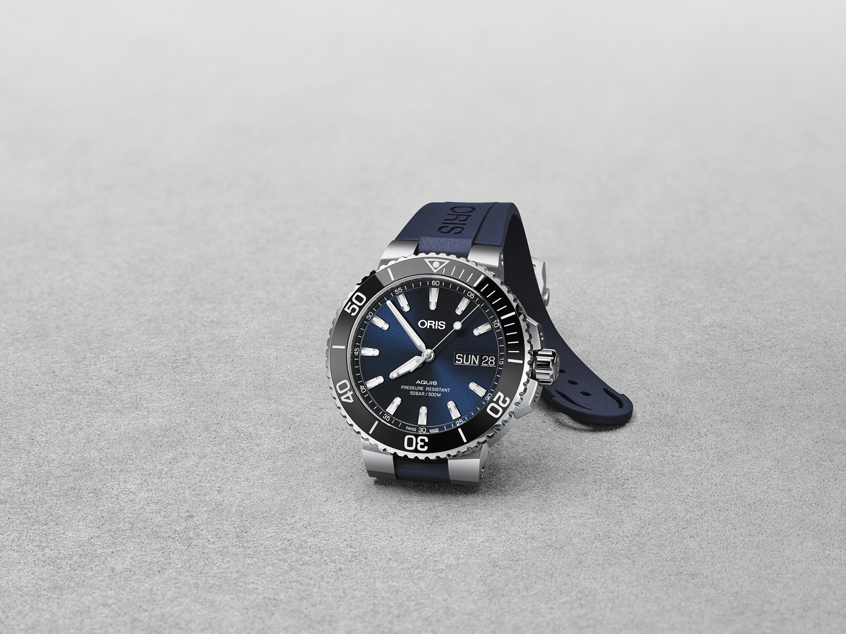 - Темно-коричневый кожаный ремешок с раскладывающейся застежкой со скользящим устройством настройки длины ремешка и удлинителем. Либо синий или черный каучуковый ремешок с разработанным Oris предохранительным якорем и раскладывающейся застежкой со скользящим устройством настройки длины ремешка иn удлинителем. Также в наличии модель на браслете из нержавеющей стали с удлинителем.