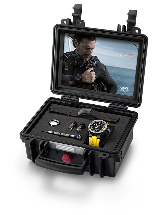 Часы «Oris Aquis Depth Gauge» комплектуются жёлтым каучуковым ремешком с созданным Oris предохранительным «якорем», не позволяющим потерять часы даже после сильного удара, а также раскладывающейся застёжкой из нержавеющей стали с PVD-покрытием чёрного цвета. Застёжка оснащена дополнительным фиксатором для изменения длины ремешка без снятия часов с запястья. Кроме того, к часам прилагается водонепроницаемый кейс с дополнительным чёрным каучуковым ремешком и специальными инструментами для быстрой смены ремешка.