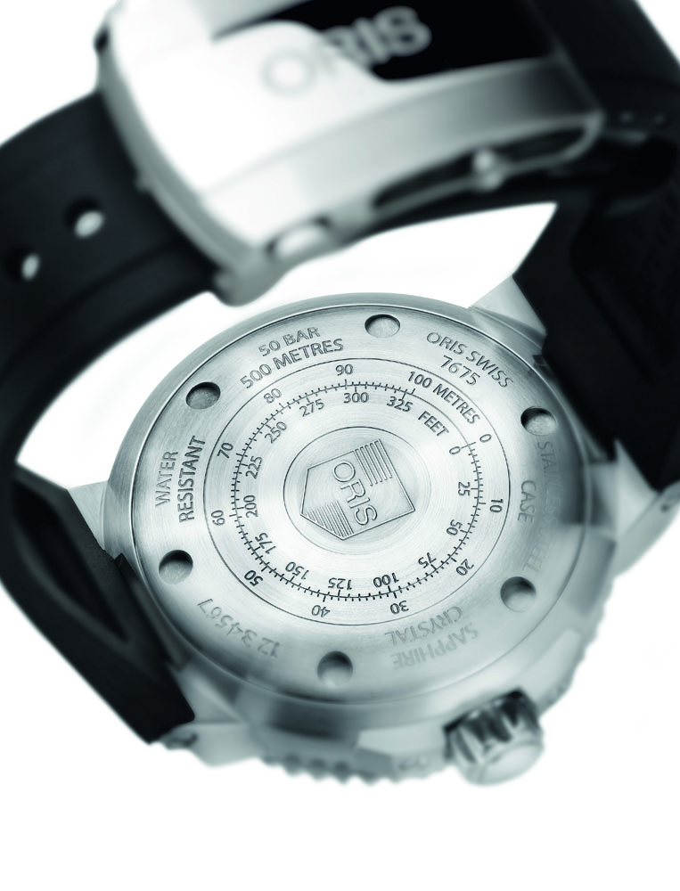 Все эти параметры специалисты компании «Oris» реализовали в часах «Oris Aquis Depth Gauge» – первых дайверских часах, которые позволяют воде проникать внутрь корпуса для измерения глубины погружения. При этом стальной корпус часов диаметром 46 мм с завинчивающейся задней крышкой, обладает требуемой водостойкостью, а именно – 500 м (50 атм.). Такой корпус хорошо зарекомендовал себя в коллекции «Aquis». Стальная задняя крышка корпуса содержит выгравированную шкалу пересчёта метров в футы от нуля до 100 м / 325 футов. Данная шкала позволяет достаточно быстро пересчитывать глубины всем дайверам, которые осуществляют свою деятельность в странах, где используются метрическая и английская системы мер.