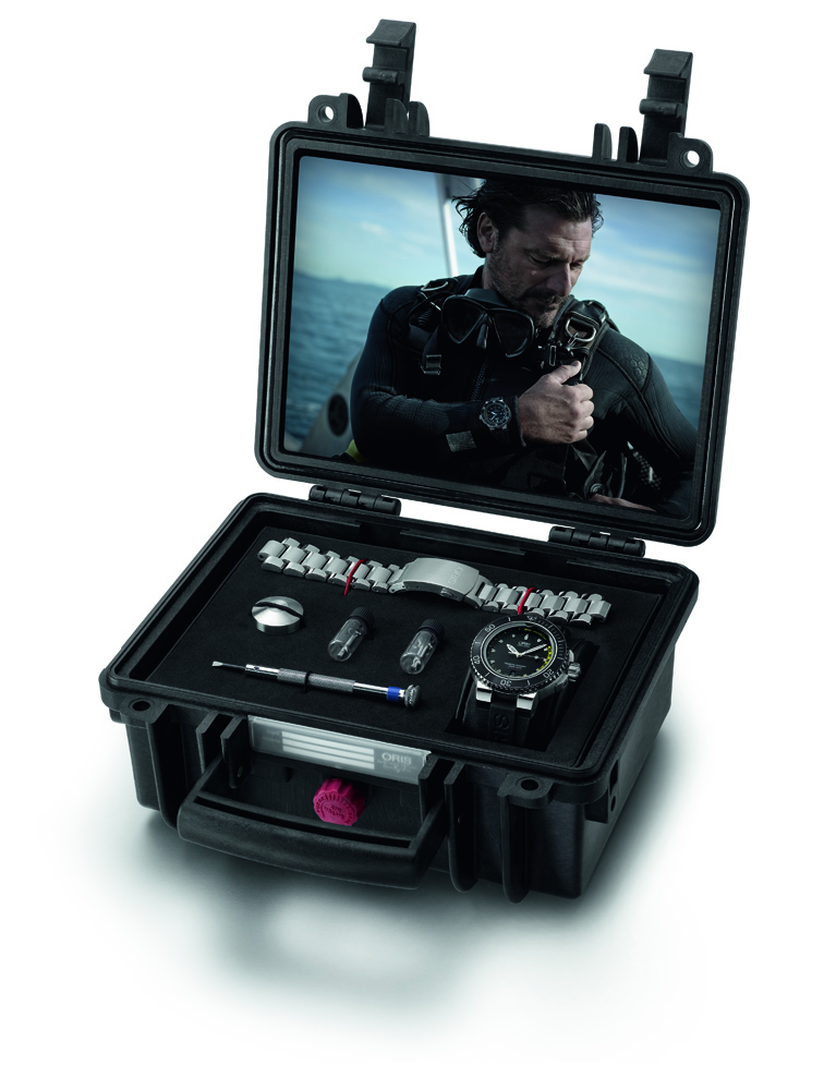 Часы Oris Aquis Depth Gauge предлагаются в комплекте со специальным водостойким кейсом с набором «Oris Aquis Depth Gauge Set». В этот набор входят: дополнительный металлический браслет, комплект инструментов для замены ремешка или браслета, а также сертификат, в котором содержится полное описание устройства точного измерения глубины погружения – новейшей разработки в сфере производства профессиональных дайверских часов. В набор также входит специальное приспособление, позволяющее производить чистку сапфирового стекла и содержать часы в идеальном порядке.