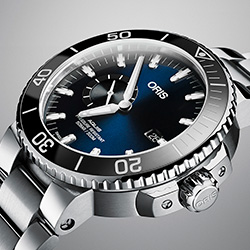 Преимущество структуры циферблата с постоянно идущей маленькой секундной стрелкой, расположенной у метки «9 часов», состоит в том, что таким образом обособляется минутная стрелка, имеющая наибольшее значение для дайверов при расчётах времени в погружении. Отправляясь под воду, дайверы согласуют минутную шкалу, изображенную на поворотном дайверском ободке однонаправленного вращения с положением минутной стрелки. Это позволяет им надежно и безопасно контролировать оставшееся время погружения. Компания Oris тесно сотрудничает с сообществом дайверов и, полагаясь на их отзывы и предложения, решила разработать в своих мастерских часовой механизм с маленькой секундной стрелкой, установленной у 9-часовой отметки.