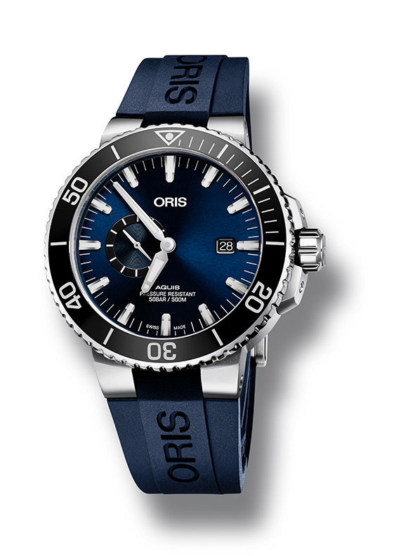Изначально выпущено два варианта исполнения часов Aquis Small Second, Date. Модель с синим циферблатом предлагается на синем или черном каучуковом ремешке с разработанным Oris предохранительным якорем. Или на стальном браслете, в обоих вариантах с раскладывающейся застежкой со скользящим устройством настройки длины ремешка, которое позволяет расслабить ремешок или браслет, либо подтянуть его, не снимая часы с руки. Те же самые преимущества реализованы в модели, выполненной в черном и оранжевом тонах, которая предлагается на черном каучуковом ремешке, а детали циферблата декорированы люминофором Super-LumiNova® оранжевого цвета (стрелки и маркеры часовой шкалы). Оранжевый признан одним из наиболее заметных цветов в подводном погружении. Поэтому его применение в декоре дайверских часов совершенно естественно.