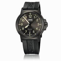11. Oris Aviation BC 3 Advanced Day Date 01 735 7641 4263-07 4 22 05G Многокомпонентный корпус из нержавеющей стали с PVD-покрытием цвета серой оружейной стали. Тёмно-серый циферблат с арабскими цифрами одинаковой величины, условными часовыми индексами и стрелками, покрытыми люминесцентным составом «Superluminova» цвета «old radium». Чёрный каучуковый ремешок с застёжкой из нержавеющей стали с PVD-покрытием серого цвета. |