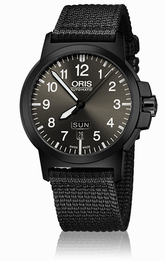10. Oris Aviation BC 3 Advanced Day Date 01 735 7641 4263-07 5 22 22G Многокомпонентный корпус из нержавеющей стали с PVD-покрытием цвета серой оружейной стали. Тёмно-серый циферблат с арабскими цифрами одинаковой величины, условными часовыми индексами и стрелками, покрытыми люминесцентным составом «Superluminova» цвета «old radium». Тёмно-бежевый текстильный ремешок с застёжкой из нержавеющей стали с PVD-покрытием серого цвета. |