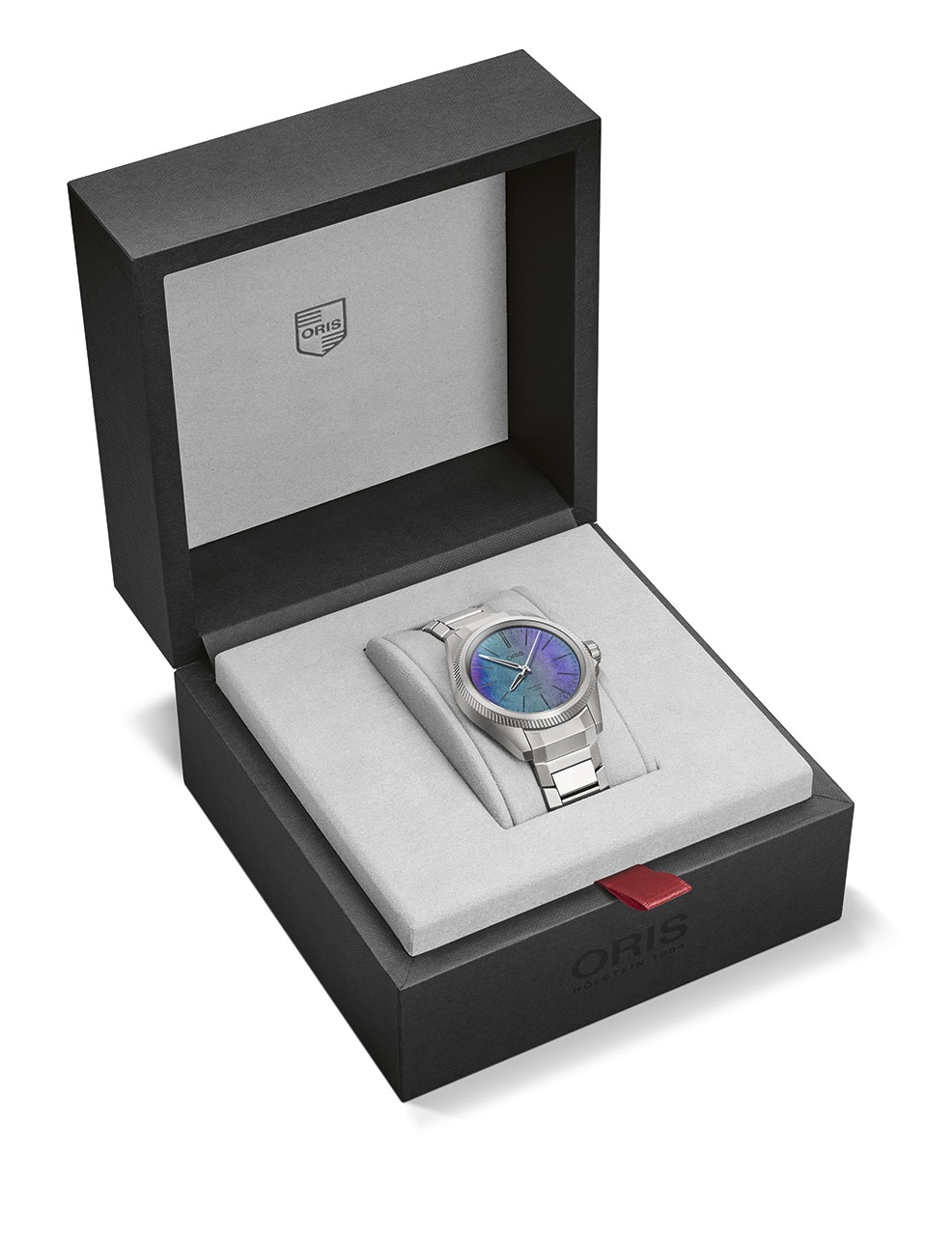 Циферблат Oris ProPilot X Calibre 400 Laser — это воплощение технологического мастерства и эстетического совершенства. Лазерная обработка, используемая для создания этого оптического эффекта, является настоящим технологическим прорывом, разработанным в сотрудничестве с ETH Zurich. Переливчатый эффект циферблата напоминает природные явления, такие как изменение цвета у насекомых и бабочек, за счет манипуляций с поверхностью титана, которая отражает определенные длины волн света.