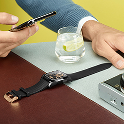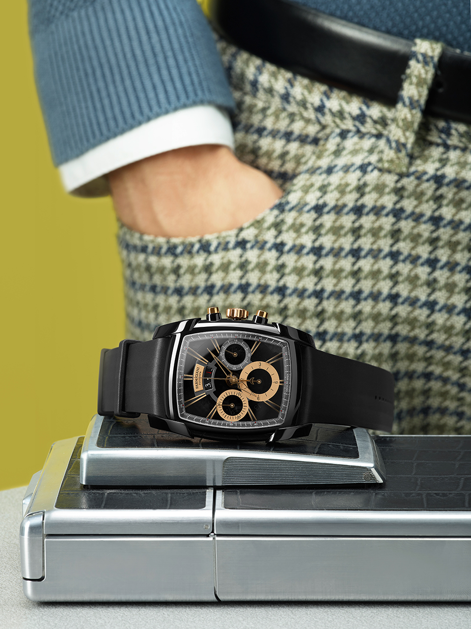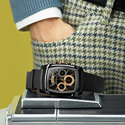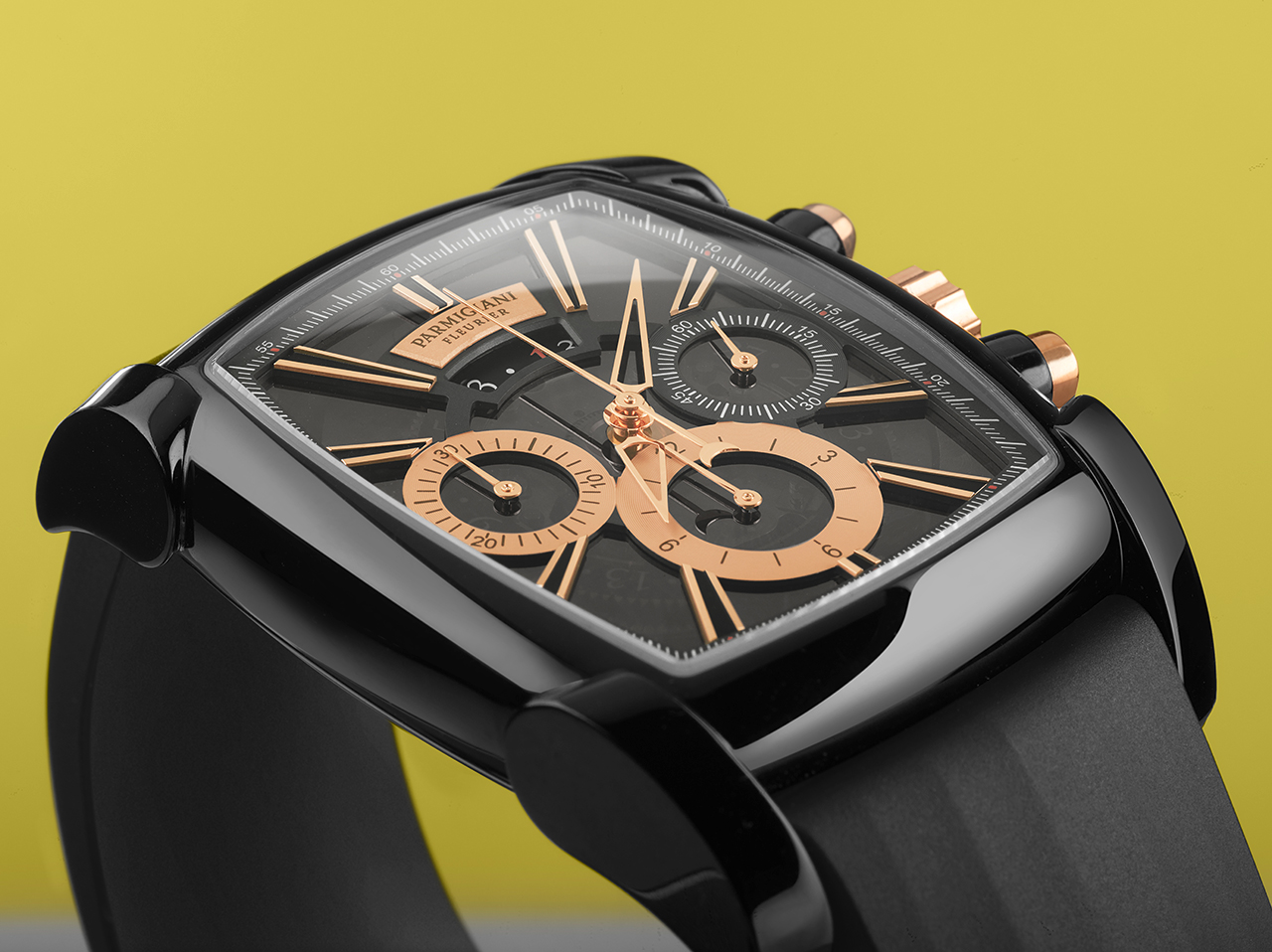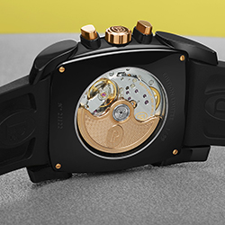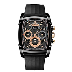 - Полированная сталь с черным ADLC покрытием, заводная головка и кнопки хронографа из 18-каратного полированного розового золота.