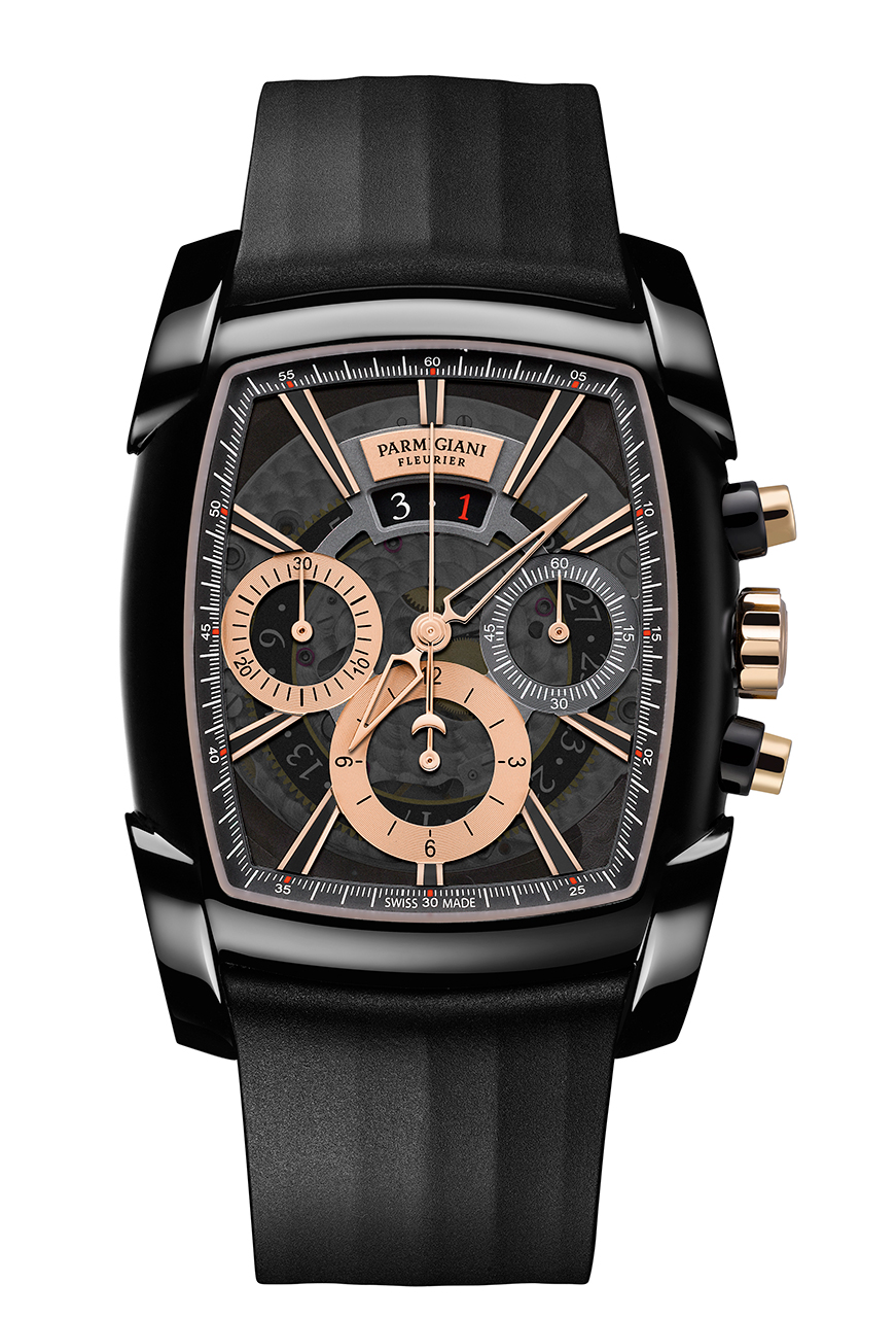В честь вечного сочетания черного и белого и его символизма компания Parmigiani Fleurier представляет женскую модель Kalpagraphe в корпусе из розового золота с бриллиантами с белым сапфировым циферблатом и глянцевую черную мужскую модель Kalpagraphe с серым сапфировым циферблатом. Как и все модели линейки Kalpa, обе они имеют бочкообразную форму.