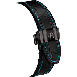 - Ремешок: Кожа с узором «под крокодила» и голубой строчкой.