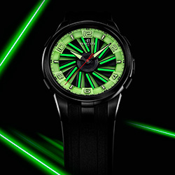 Ее название определяет главную особенность этой новинки. Это часы с полностью люминесцентным циферблатом: фланец с рельефными арабскими цифрами и индексами, нижний циферблат и лопасти турбины покрыты люминесцентным составом Super-LumiNova, излучающим зеленое свечение. При каждом повороте запястья вращение турбины создает особу светящуюся анимацию и удивительные оптические эффекты, которые одновременно вызывают интерес и восторг, привлекают внимание и могут стать предметом беседы.