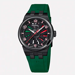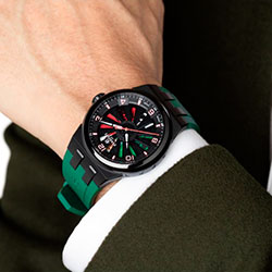 - Ремешок: Зеленый каучуковый с застежкой из титана класса 2 с черным DLC покрытием.