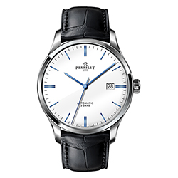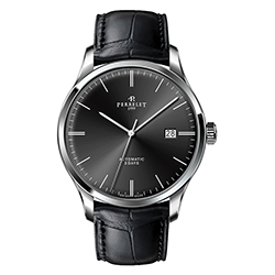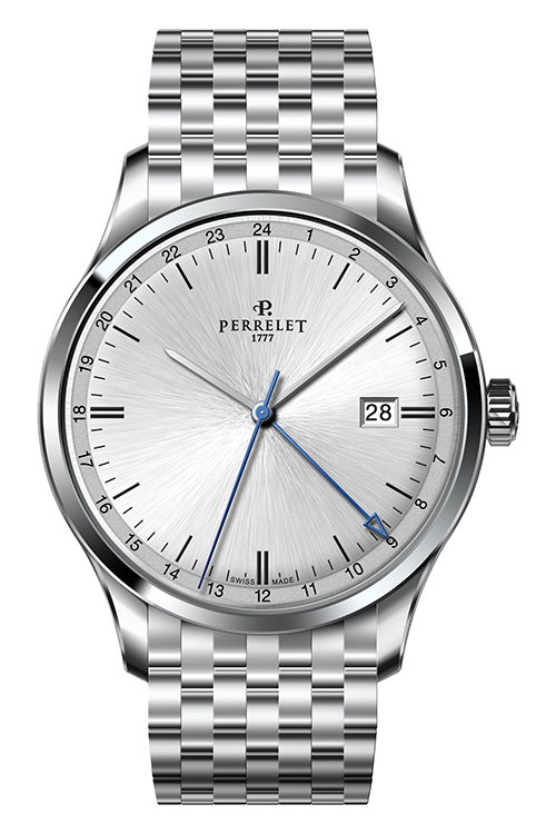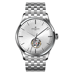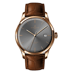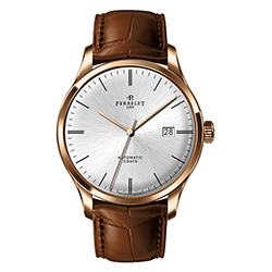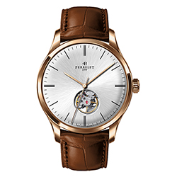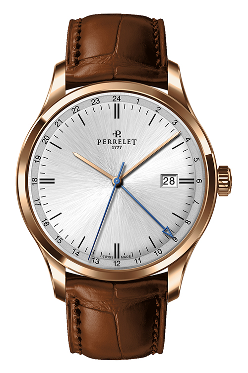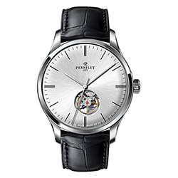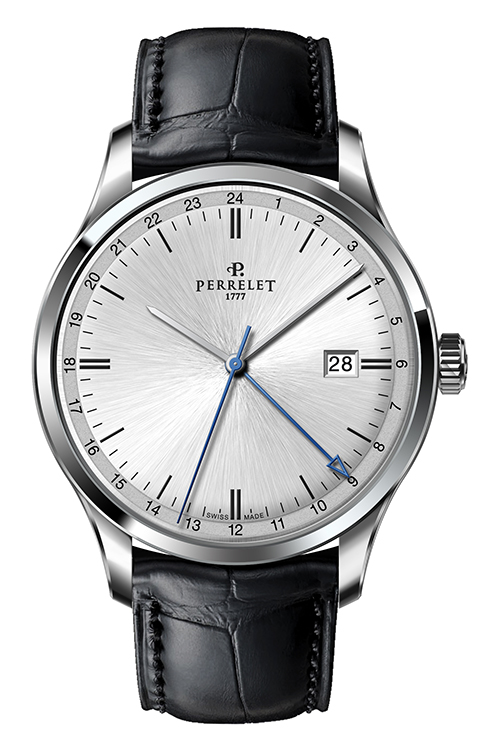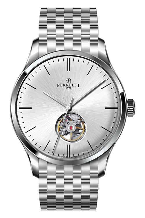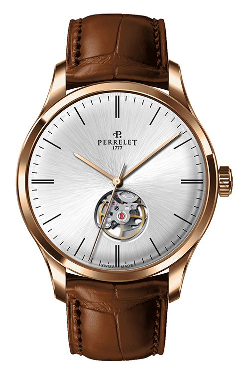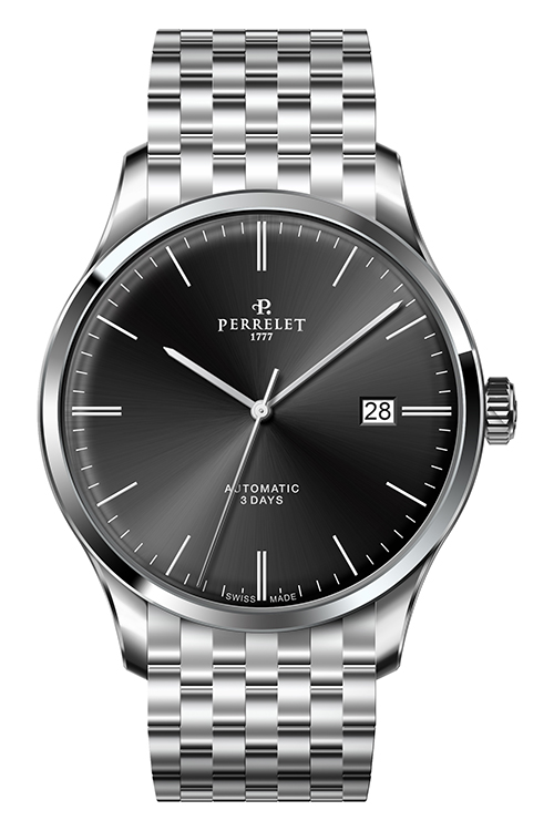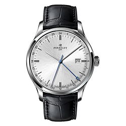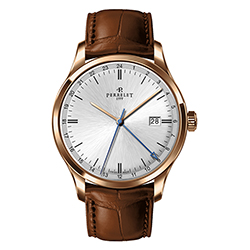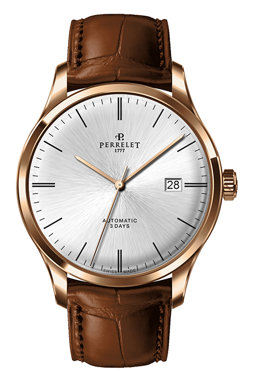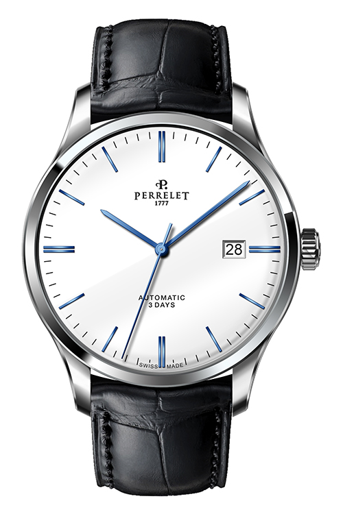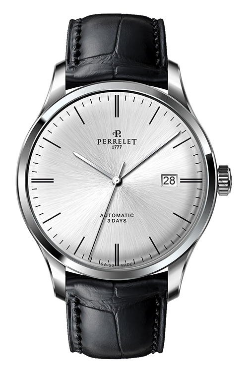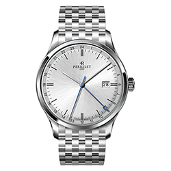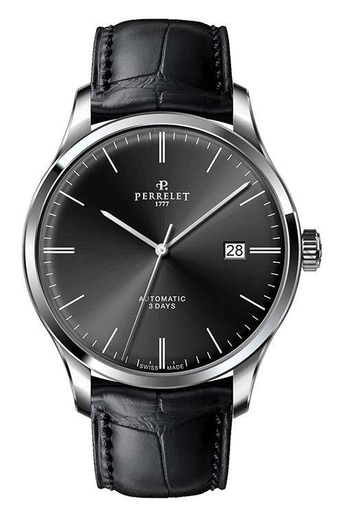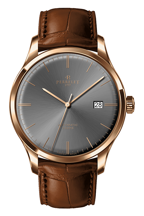 Ремень из телячьей кожи с отделкой под аллигатора черного или коричневого цвета снабжен застежкой с логотипом Perrelet. Такая отделка гармонично сочетается с декором корпусов. Модель «3 стрелки» также представлена в вариантах со стальным браслетом.