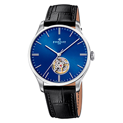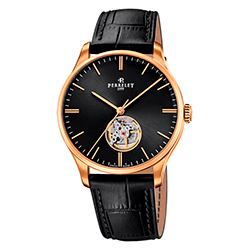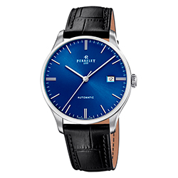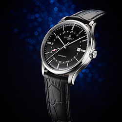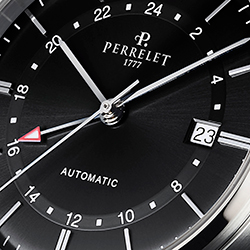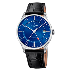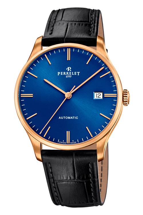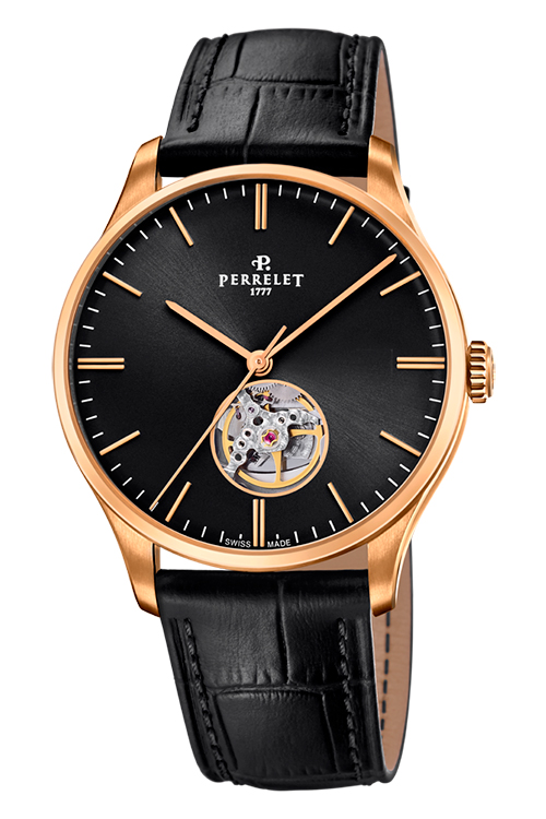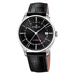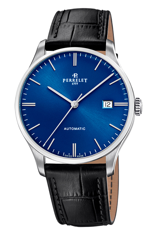 - Черный кожаный с выделкой под аллигатора и с классической застежкой с логотипом Perrelet.