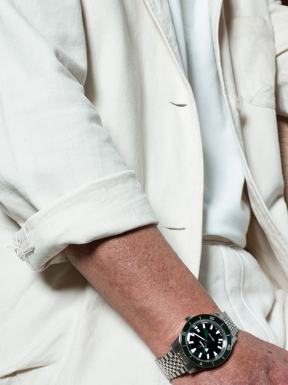 Корпус: вращающийся безель из нержавеющей стали со вставкой из полированной высокотехнологичной керамики зеленого цвета, на которой выгравированы металлизированные цифры, деления и метки
