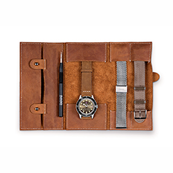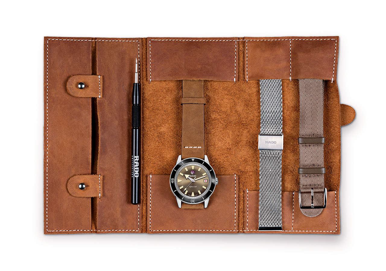 Аксессуары: брендированный дорожный кейс Rado из кожи коричневого цвета с дополнительным ремешком и браслетом, а также инструментом для замены ремешка.