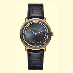 Фирменный материал Ceramos цвета розового золота — это удивительное сочетание, состоящее на 90% из высокотехнологичной керамики и на 10% из металлического сплава. Корпус конструкции моноблок имеет толщину всего 5,3 мм и диаметр 38 мм. Он отлично подойдет для запястья любой толщины. Перламутровый циферблат, украшенный 48 бриллиантами Top Wesselton, кожаный ремешок с перламутровым тиснением и корпус из материала Ceramos — так выглядит великолепное сочетание материалов от компании Rado.
