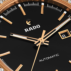 На тёмно-сером циферблате установлены центральные стрелки часов, минут и секунд цвета розового золота. Часовая и минутная стрелки декорированы чёрным винировым покрытием и белым фирменным люминесцентным составом «Superluminova». Условные часовые индексы также выполнены в цвете розового золота, а их кончики обработаны белым фирменным люминесцентным покрытием «Superluminova». Кроме того, на циферблате находятся: движущийся золотистый символ в виде якоря, логотипы «Rado» и «Automatic» серебристого цвета, а перед отметкой «3 часа» помещена прямоугольная, выполненная в цвете розового золота, апертура даты.