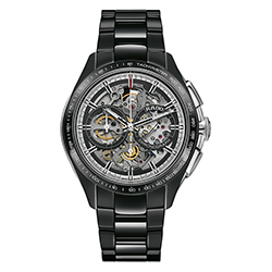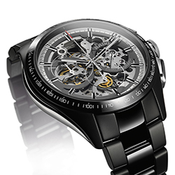 В хронографе HyperChrome Skeleton масса интересных элементов, которые следует тщательно рассмотреть. Скелетонированный циферблат, платина и мосты, срезанные до минимума, открывают взору внутреннее устройство механизма с движущимися деталями. Все эти компоненты привлекают к часам всеобщее внимание. Черный матовый корпус из высокотехнологичной керамики отлично контрастирует с черным полированным безелем. Благодаря этому подчеркнута прозрачность без ущерба для читаемости циферблата. Легкость, устойчивость к царапинам и комфорт при ношении обеспечиваются за счет конструкции моноблок ударопрочных часов.