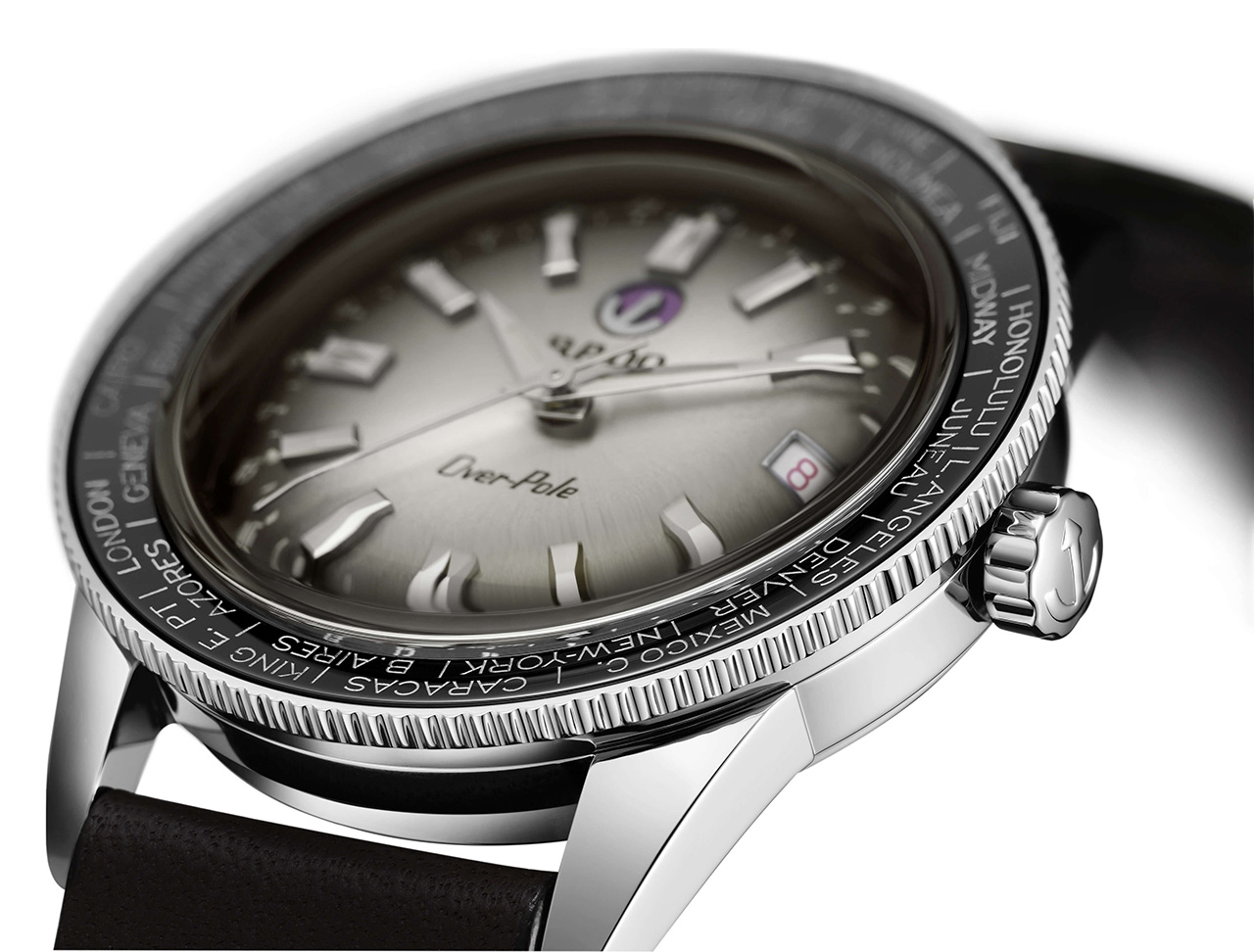 - Вращающийся в двух направлениях безель из полированной нержавеющей стали со вставкой из полированной высокотехнологичной керамики черного цвета, на которой выгравированы и покрыты лаком серебристого цвета названия городов.