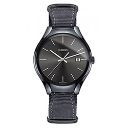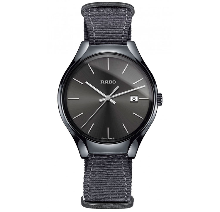 1. Rado True Colours Gray 01.115.0232.3.110 Корпус-моноблок, заводная головка и застёжка – из высокотехнологичной керамики серого цвета. Титановая задняя крышка. Серый циферблат с центральными стрелками и условными индексами с родиевым покрытием. Окошко даты. Ремешок в стиле NATO из серой ткани с застёжкой. |