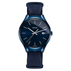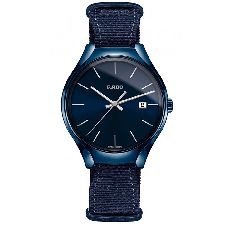 2. Rado True Colours Blue 01.115.0235.3.120 Корпус-моноблок, заводная головка и застёжка – из высокотехнологичной керамики тёмно-синего цвета. Титановая задняя крышка. Тёмно-синий циферблат с центральными стрелками и условными индексами с родиевым покрытием. Окошко даты. Ремешок в стиле NATO из тёмно-синей ткани с застёжкой. |