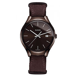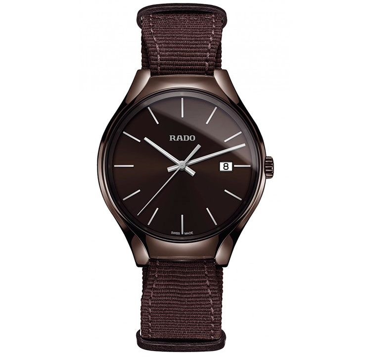 3. Rado True Colours Brown 01.115.0234.3.130 Корпус-моноблок, заводная головка и застёжка – из высокотехнологичной керамики шоколадно-коричневого цвета. Титановая задняя крышка. Шоколадно-коричневый циферблат с центральными стрелками и условными индексами с родиевым покрытием. Окошко даты. Ремешок в стиле NATO из шоколадно-коричневой ткани с застёжкой. |
