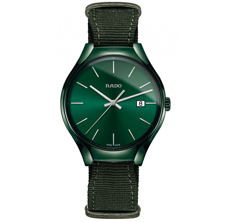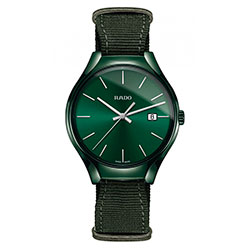 4. Rado True Colours Green 01.115.0233.3.131 Корпус-моноблок, заводная головка и застёжка – из высокотехнологичной керамики тёмно-зелёного (British racing green) цвета. Титановая задняя крышка. Тёмно-зелёный циферблат с центральными стрелками и условными индексами с родиевым покрытием. Окошко даты. Ремешок в стиле NATO из тёмно-зелёной ткани с застёжкой. |