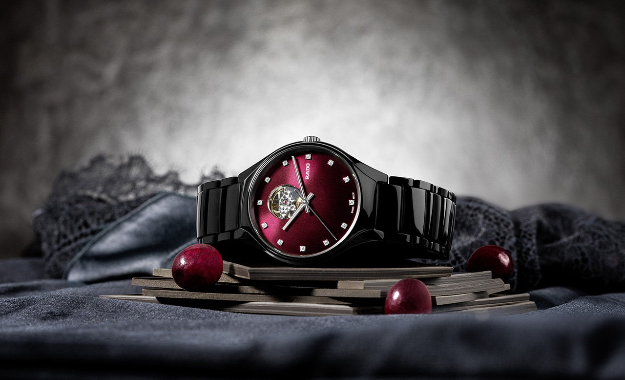 В часах Rado True Secret Ceramic безупречность керамики черного цвета объединяется с чувственным красным — цветом любви. Красный цвет присутствует на циферблате в виде мерцающих оттенков от темно-вишневого до черного. Цветовой градиент от насыщенного к более светлому подчеркивает мистическую ауру этих часов, чей секрет становится явью на 12-часовом делении. Сквозь маленькое круглое отверстие открывается часовой механизм: чутко сбалансированный и живой.
