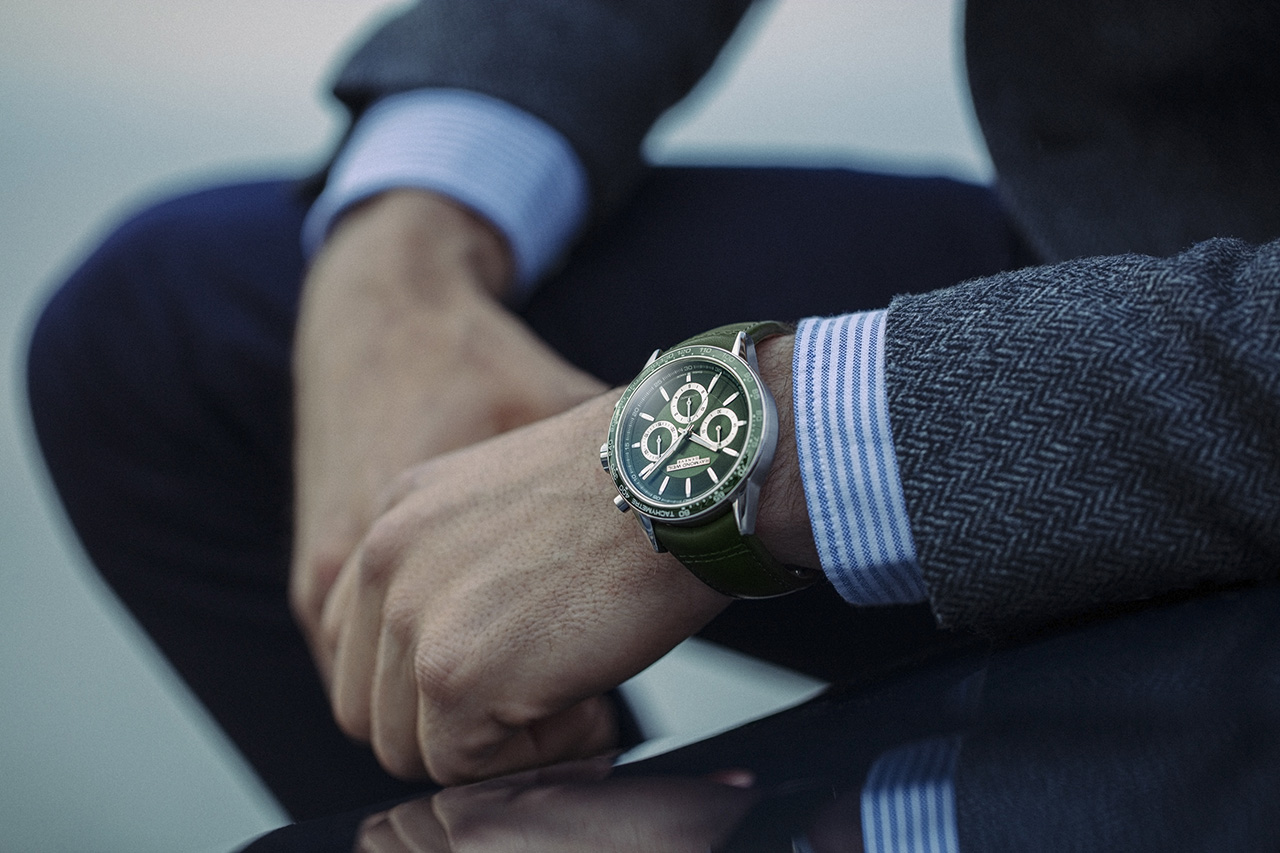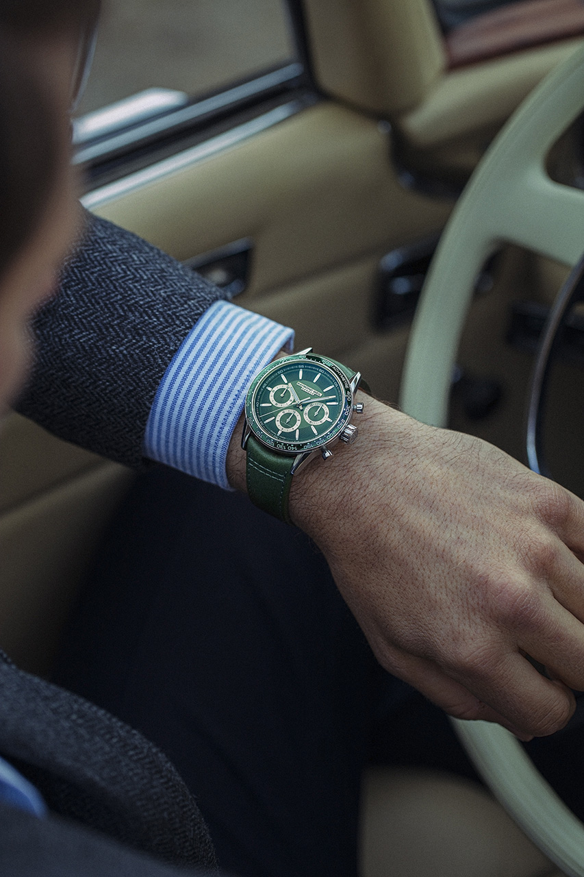Пожалуй, одной из самых привлекательных моделей новой коллекции является модель 7741-SC7-52021, представленная в завораживающем зеленом цвете. У этой модели 30-минутный и 12-часовой окошки хронографа оснащены хорошо читаемыми белыми стрелками, а все три счетчика обрамлены серебристыми кругами. Часть циферблата с часовыми метками выполнена в виде улитки – это придает дисплею восхитительную текстуру. А уникальный цвет циферблата добавляет модели привлекательности.