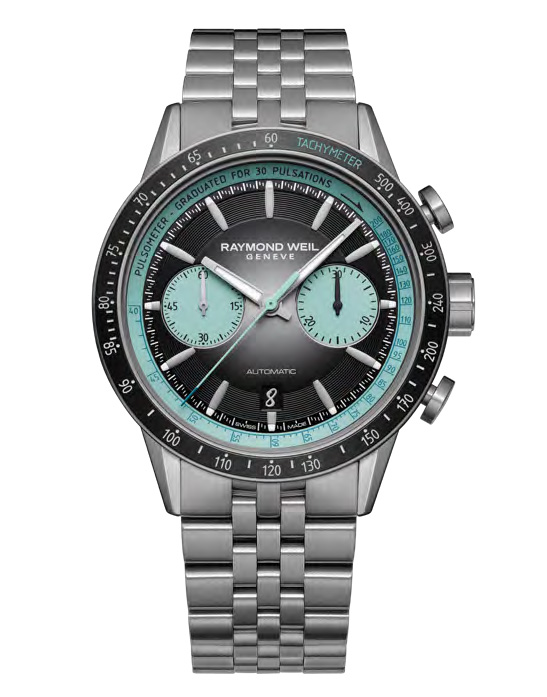 Титановый корпус размером 43,5 мм с черным керамическим тахиметрическим безелем обладает всеми признаками хронографа RAYMOND WEIL. Автоматический механизм RW5030, 56-часовой запас хода, завинчивающаяся и рифленая заводная головка с монограммой RW.