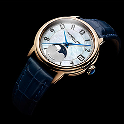 Поддайтесь соблазну мягких изгибов новых часов Maestro Ladies. Чистота перламутра и аккуратная апертура фазы луны создают идеальную гармонию между элегантностью, изысканностью и новаторством. Насыщенный темно-синий ремешок из телячьей кожи с тиснением под кожу аллигатора навевает мысли о чарующем ночном небе.