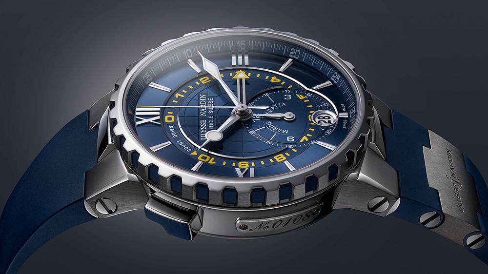 Новое вдохновение Ulysse Nardin – команда Artemis Rasing, шведский претендент на чемпионский титул на 35 Кубке Америки, сразу несколько моделей созданы в ее поддержку. Например, четкий и точный хронограф Marine Regatta с функцией обратного отсчета, для которой был получен патент. Глубокий синий оттенок циферблата словно океанские глубины с ярко-желтыми вкраплениями. Калибр стал результатом многих месяцев работы и состоит из 650 компонентов.