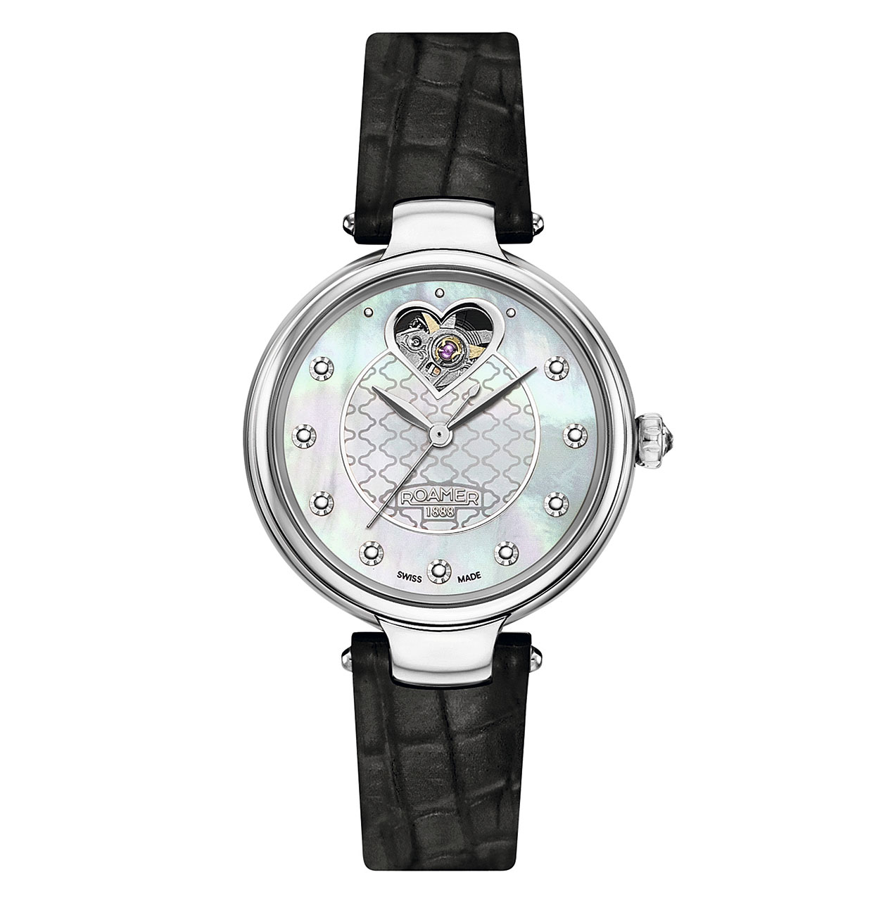 Чтобы гарантировать каждой женщине широкий простор для экспериментов с собственным стилем, дизайнеры Roamer of Switzerland создали 6 различных версий DREAMLINE I. Если вам импонируют кожаные изделия, выберите гладкий ремешок с крокодиловым тиснением в классическом черном, тонком бежевом или холодном белом цвете. Поклонники моделей с металлическим браслетом могут выбрать между чистой нержавеющей сталью и двухцветным дизайном с желтым или розовым золотом. В дополнение к трем точечным индексам над окошком в форме сердца циферблат дополнен 9 благородными мерцающими круглыми часовыми метками.