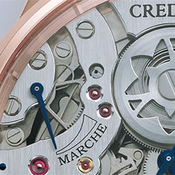 В изысканных часах с подобными усложнениями, каковыми являются Credor Spring Drive Sonnerie, молоточки механизма боя просматриваются сквозь прозрачное сапфировое стекло двойной кривизны. Корпус часов выполнен из 18-каратного розового золота: он не только подчеркивает ценность сложнейшего механизма, но и помогает достичь идеально чистого звучания. Заводной барабан механизма боя скелетонизирован в форме японского цветка – колокольчика, дрейфующего по течению реки. Это служит своеобразной аналогией непрерывного течения времени. Изображение японского цветка выбрано неслучайно: он является символом города, где расположена часовая студия Micro Artist.