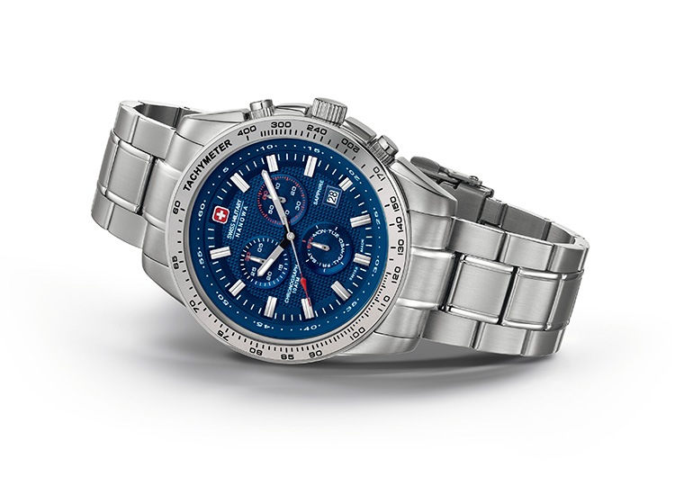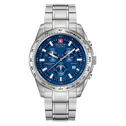 | 8. Swiss Military Hanowa Crusader Chrono 6-5225.04.003: корпус из нержавеющей стали 316L, серебристый безель с тахиметрической шкалой, синий циферблат с часовыми индексами серого цвета, браслет из нержавеющей стали. | |
