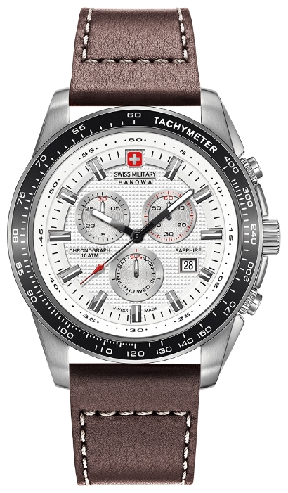 | 1. Swiss Military Hanowa Crusader Chrono 6-4225.04.001: корпус из нержавеющей стали 316L, безель с чёрным ионным покрытием и тахиметрической шкалой, белый циферблат с часовыми индексами стального цвета, коричневый кожаный ремешок с белой прострочкой. | |