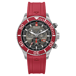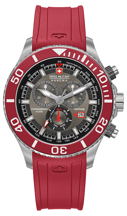 - Swiss Military Hanowa Immersion Chrono 06-4226.04.009.04: серебристый корпус, красный безель, серо-коричневый циферблат, красный ремешок.