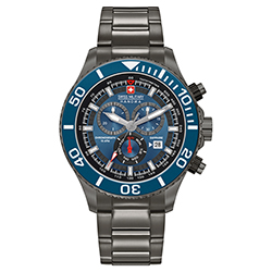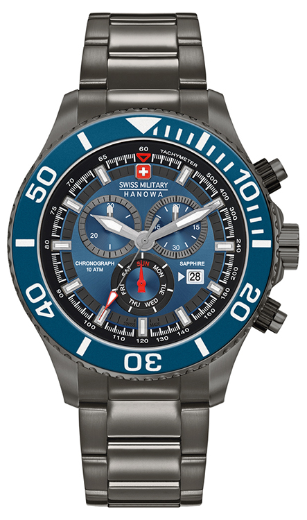 - Swiss Military Hanowa Immersion Chrono 06-5226.30.003: корпус с ионным покрытием цвета оружейной стали, синий безель, синий циферблат, браслет с ионным покрытием цвета оружейной стали.