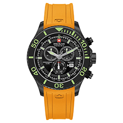 - Swiss Military Hanowa Immersion Chrono 06-4226.13.007.11: корпус с ионным покрытием черного цвета, чёрный безель, чёрный циферблат, жёлтый ремешок.