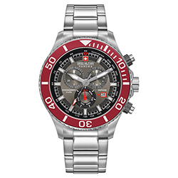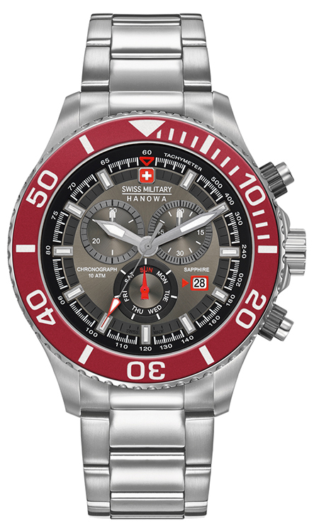 - Swiss Military Hanowa Immersion Chrono 06-5226.04.009: серебристый корпус, красный безель, серо-коричневый циферблат, серебристый браслет.