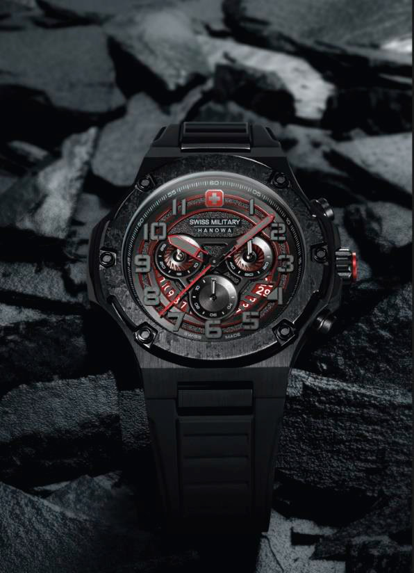 Хронограф Mission XFOR 01 создан, чтобы выделяться и притягивать внимание. Серый циферблат, имитирующий графитовую поверхность, с красными, в цвет швейцарского флага, акцентами, накладные арабские цифры и стрелки с люминесцентным составом, красный скелетонизированный диск даты. Верный швейцарским корням, мощный полностью черный 44 мм корпус, черный силиконовый ремешок. Высококачественная отделка, прочный корпус. SWISS MILITARY HANOWA Mission XFOR 01 – идеальные сухопутные часы.