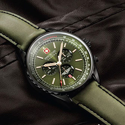 Высокоточный хронограф в авиационном стиле в корпусе диаметром 44 мм из оружейной стали. Суровый «зубастый» безель дополняет яркий циферблат цвета хаки с эффектом солнечных лучей с золотистыми часовыми индексами и стрелками-градусниками. Красный флаг Швейцарии на позиции «12 часов» поддержан красной датой на позиции «6 часов», а также с красным наконечником центральной стрелки хронографа. Счетчики глубоко утоплены и исполнены в темно-зеленом цвете.